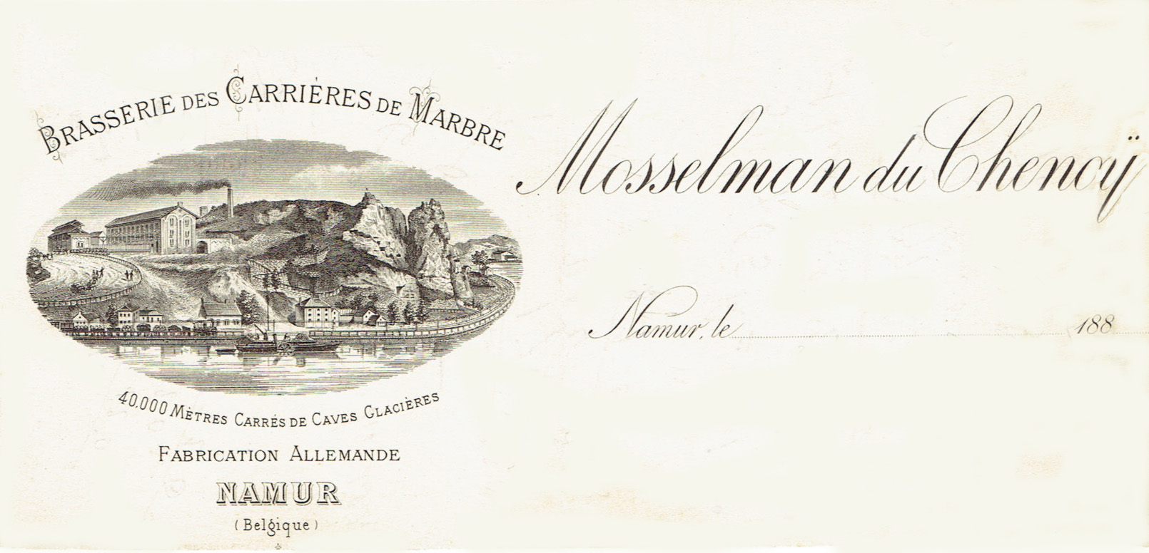 dans un des bâtiments. Il faut savoir que l’endroit était devenu lieu de promenades dominicales pour les Namurois. En 1857, l’extension de la carrière à ciel ouvert alimentant les premiers des nouveaux fours à chaux détruisit toute trace des bâtiments. On a exploité très tôt le calcaire dans les collines qui ceinturent au nord le territoire de Namur ; des dalles funéraires de citoyens romains (des Namurois) du 2e siècle découvertes à la citadelle en sont la preuve. Il s’agit bien de pierre bleue de provenance locale. Au Moyen Age, des débris de sculptures recueillis ça et là en témoignent aussi. Les carrières namuroises (une dizaine en 1289), en plus de fournir la localité, exportaient dans le pays de Liège. L’extraction y était donc importante au point d’entraîner des attaques, notamment en 1203, lorsque des émeutiers s’emparèrent à Huy d’un bateau chargé de « pierres de Namur » faisant route vers Liège. Les piliers de la collégiale de cette ville étaient en pierres de Namur, livrées en 1310. Considérée comme matériaux de luxe, l’emploi de la pierre namuroise était réservé à l’architecture monumentale (édifices religieux ...). A la fin du 19e siècle, une brasserie dite « des Carrières de Marbre » semble avoir utilisé les lieux pour y faire fermenter ses bières.